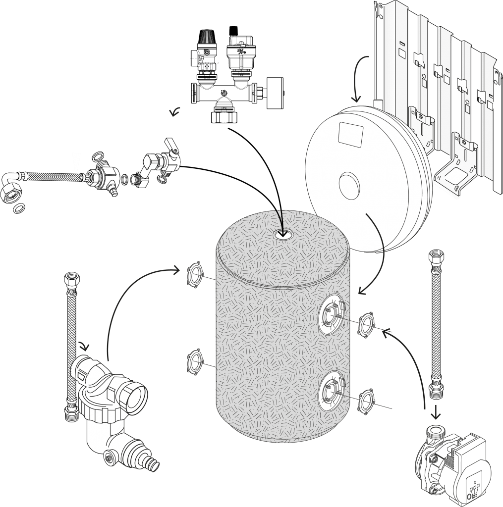 Le HM-B50 assure les fonctions essentielles de découplage, de stockage et de mélange des générateurs de chaleur. Livré en kit complet sous emballage individuel, il regroupe l’ensemble des composants nécessaires pour un montage rapide, sans risque d’oubli ni d’aller-retour chez le fournisseur.