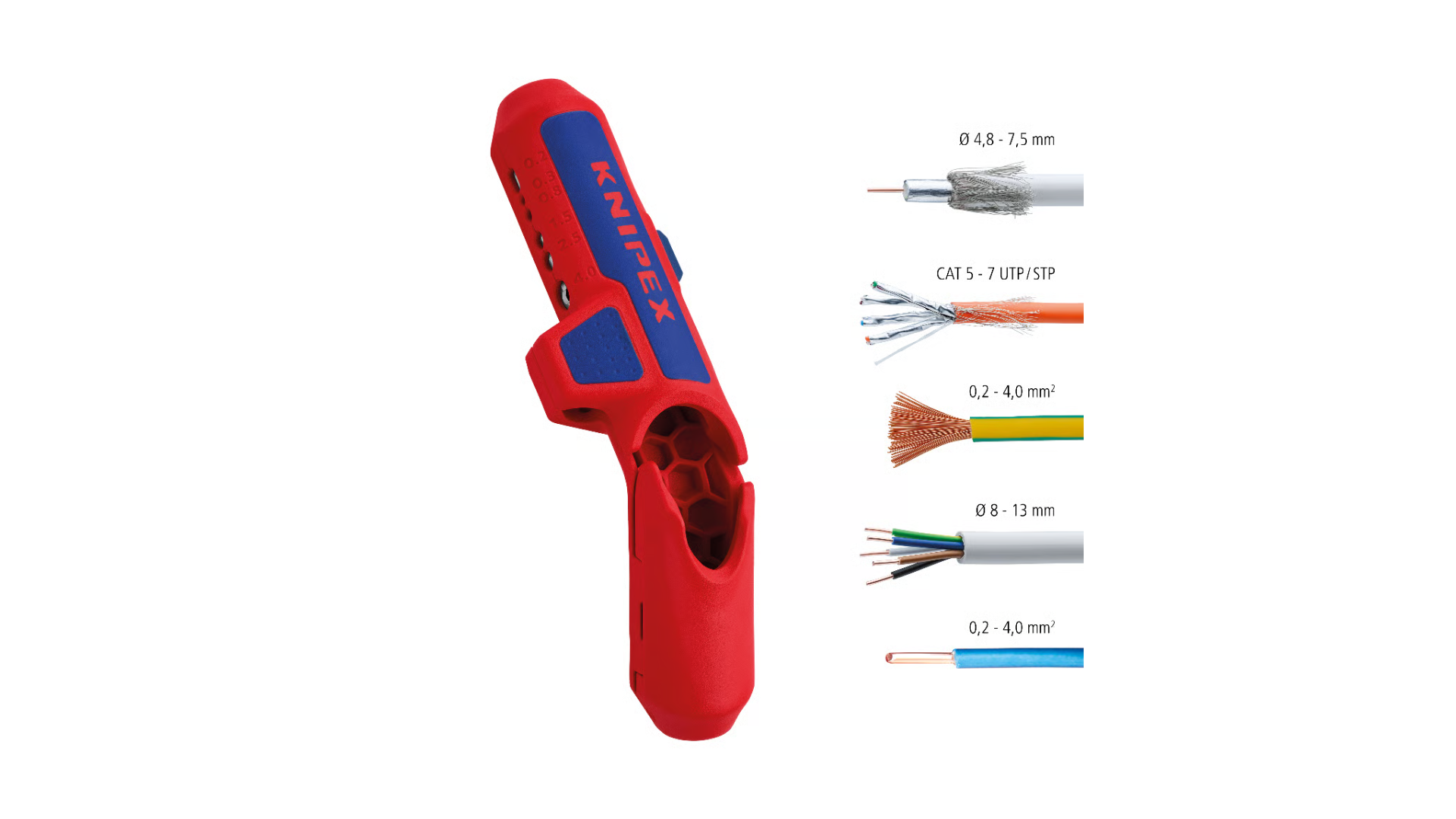 Pour le dégainage et le dénudage rapide et précis de tous types de câbles ronds et hydrofuges standards (par ex., câble NYM 3 x 1,5 mm² jusqu‘à 5 x 2,5 mm²), câbles de données (par ex. paires torsadées) et câbles coaxiaux